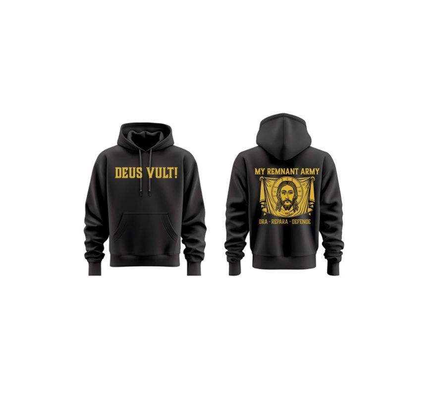 Blk “Deus Vult!” Pull over Hoodie/My Remnant Army Logo in the back of the sweatshirt.