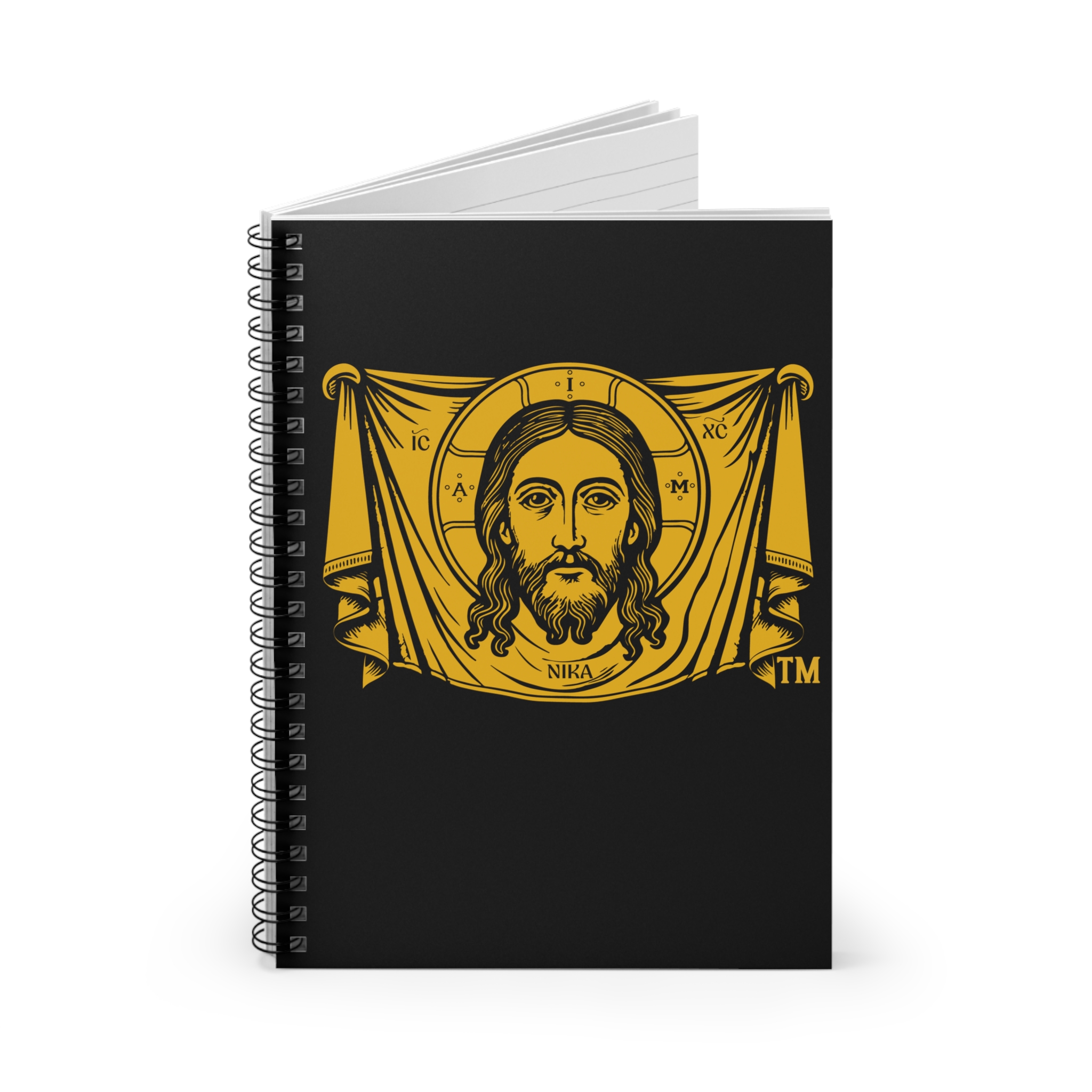 This ruled spiral notebook brings a quietly sacred presence to everyday writing. The matte black cover showcases a bold, gold icon-style image that feels both timeless and reverent — like a talisman you carry to keep thoughts steady. Inside, smooth 90 gsm ruled pages invite deliberate handwriting, quick prayers, sermon notes, or sketches. A discreet document pocket in the back keeps loose papers and receipts tucked away, while the metal spiral lets pages turn flat or be removed cleanly. At 6″ x 8″, it slips into bags and stays ready for church, classes, or reflective moments at home.