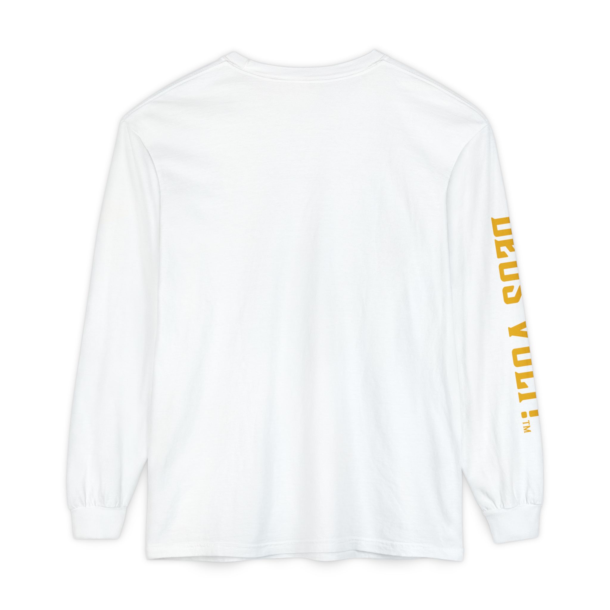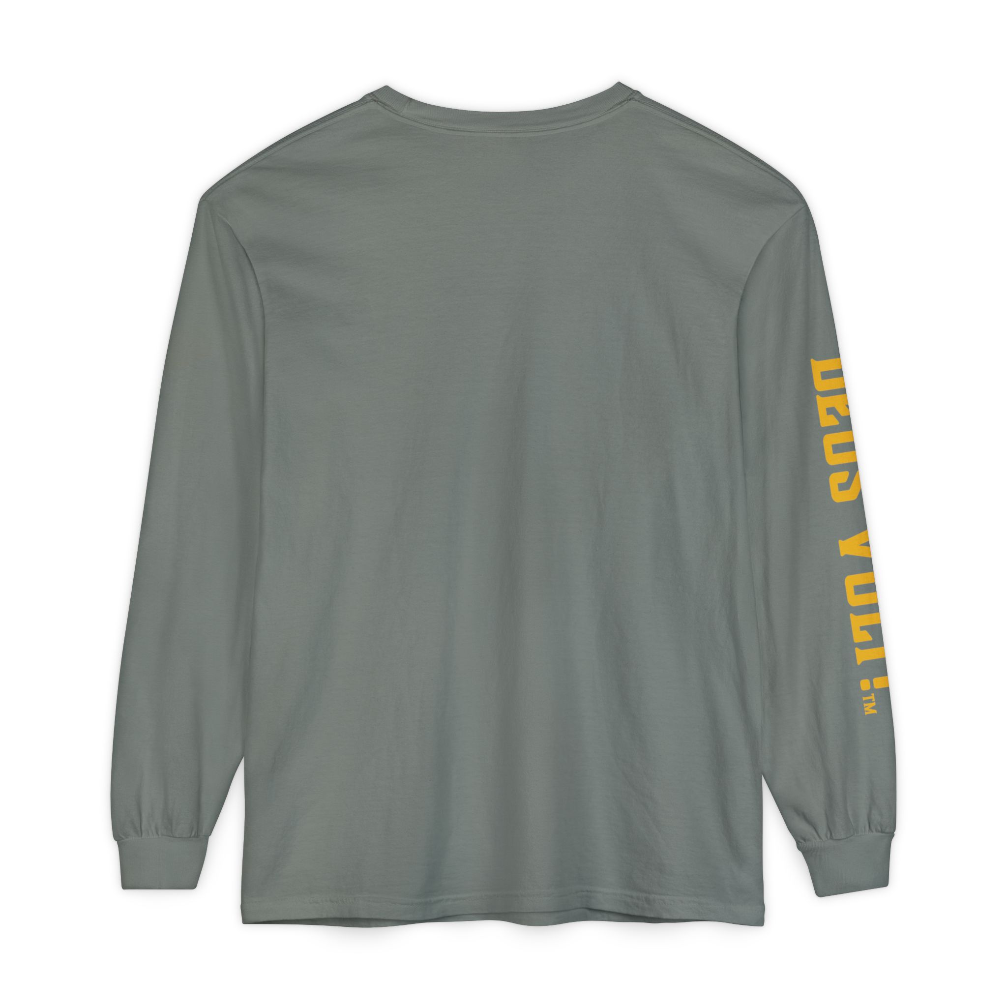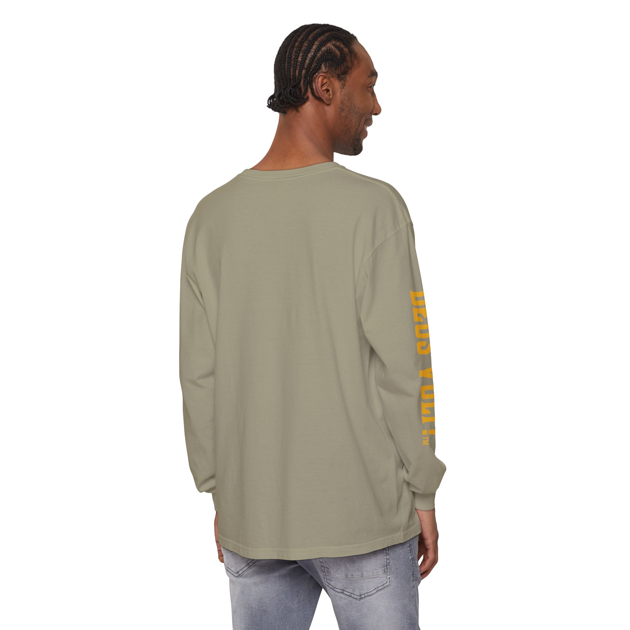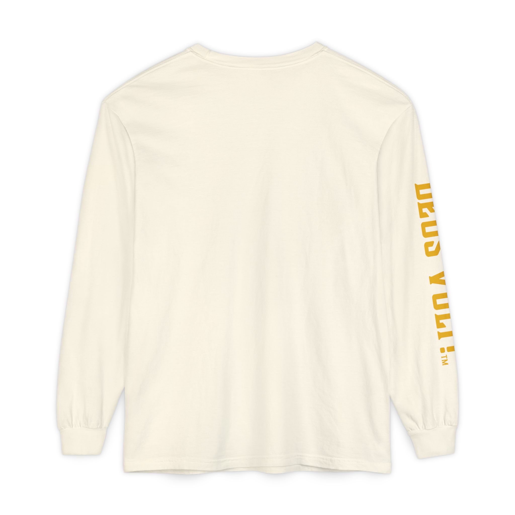 Soft, garment-dyed long sleeve with a quiet, devotional edge. The shirt’s warm, washed-in color and vintage-feel print invite calm confidence — a wearable nod to personal conviction that doesn’t shout. The front panel features a centered emblem and bold lettering on the sleeve, balanced by clean, minimal back. It drapes like a lived-in favorite and feels steady in the hand: slightly weighty, smooth ring-spun cotton that wears in rather than out. Slip it on for slow mornings, community gatherings, or evenings when you want your values to be seen without having to explain them.